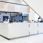 The scope of the project included the fit outs in several rooms of the canteen, located on two storeys – on the ground floor: kitchen, serving area, counter with a cash desk and a part of the dining room, whereas on the mezzanine floor there were more chairs, tables and sofa, being the place for meal consumption. All these elements were refined perfectly, and everything was done using top quality components. To ensure high standards, before signing the contract, the customer requested us to deliver certificates for materials used for furniture manufacturing (e.g. Corian on countertops, oil used to preserve solid wood etc.). Most furniture was made to measure and even such details as handgrips, laminated materials, oiling or shade of upholstery were adjusted to customer’s suggestions.