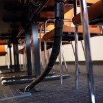 Specyfikacja projektu objęła również wykonanie w blatach stołów przyłączy do kabli, czyli tzw. mediaportów. Jeden z nich – największy – dostarczył Klient. Należało go zainstalować w trakcie realizacji. Tego typu zadania wykonujemy na miejscu i od ręki, tak też było i w tym przypadku.