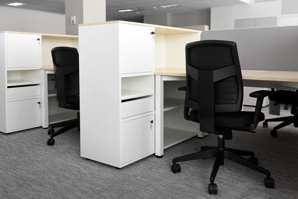 Poza wyposażeniem wyżej omówionych elementów open space, zostaliśmy również poproszeni o dostarczenie szaf oraz mniejszych szafek archiwizacyjnych. Konieczne było przy tym zaprojektowanie ich niemal od podstaw – bo o ile zwykłe, duże, dwudrzwiowe szafy archiwizacyjne nie stanowiły większego problemu, o tyle istniała jeszcze konieczność zabudowywania ścian nieco mniejszymi szafkami i szufladami, spośród których każda posiadała osobny klucz i była przypisana do konkretnego pracownika. Wiedzieliśmy, że klient posiada swoje wewnętrzne wytyczne dotyczące rozmiarów używanego papieru oraz sposobu jego przetrzymywania i archiwizowania. Na tej podstawie powstał projekt szuflad i szafek z drzwiami przesuwnymi (co zaoszczędziło nieco miejsca), które były dopasowane stricte pod potrzeby tego konkretnego zleceniodawcy – prawdopodobnie nie spełniłyby dobrze swojej roli w żadnym innym pomieszczeniu.