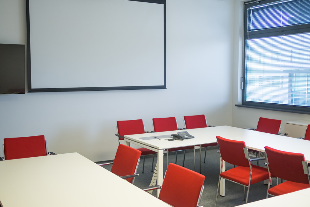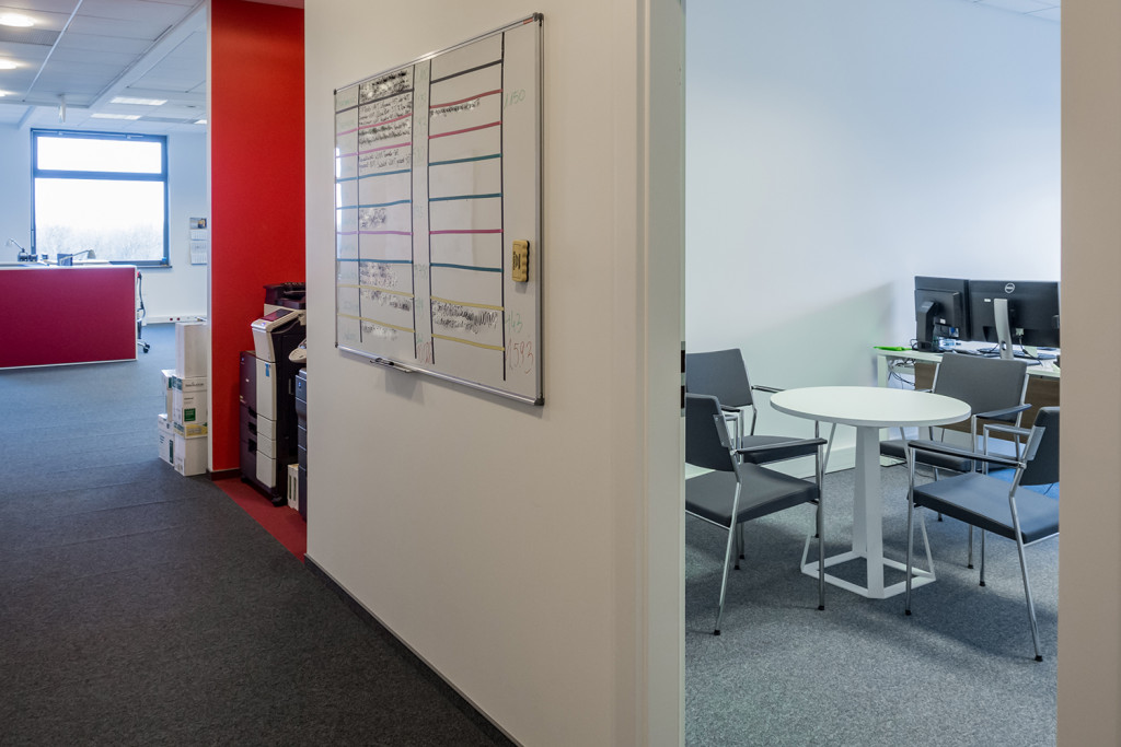 Po obu stronach recepcji znajdują się wejścia do zaaranżowanych przez nas sal konferencyjnych. Jedna z nich jest mniejsza, sześcioosobowa, przeznaczona bardziej do spotkań wewnętrznych. Druga z kolei ma możliwość podziału na pół, dzięki wysuwanej, mobilnej ścianie działowej. Fakt ten musieliśmy uwzględnić przy dostarczaniu stołów konferencyjnych – jak widać na zdjęciach można je swobodnie dostosowywać do aktualnych potrzeb. Oprócz tego konieczne było zastosowanie elastycznych kręgosłupów kablowych oraz media portów. W salach znajdują się krzesła, których kolorystyka jest spójna ze stanowiskami pracowniczymi, co było jednym z głównych wymagań Klienta.