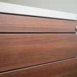 Wśród wyposażonych pomieszczeń były również gabinety członków zarządu. W porównaniu z resztą projektu mieliśmy tu do czynienia z dwoma zasadniczymi zmianami – koniecznością zamontowania większego L-kształtnego biurka oraz nieco zmienioną kolorystyką (fronty szafek i blenda w kolorze typu orzech)