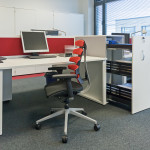 Biurka wykonane są na pełnych płozach – nogi połączone są ze sobą belką zarówno u dołu jak i góry, co powoduje efekt lekkiego, jakby „lewitującego” blatu. Jednocześnie jest to jedna z najbardziej stabilnych i odpornych na obciążenia mechaniczne konstrukcji na rynku. Dodatkowo biurka zostały wyposażone w przesuwne blaty, dające swobodny dostęp do okablowania. Wzdłuż krótszych boków biurek pracownicy oddzielni są od siebie bardzo wygodnymi i cichymi kontenerami typu cargo – każdy z pracowników ma do swojego użytku jeden taki mebel, a oprócz tego może korzystać z mobilnych kontenerów pod biurkowych. W ramach zachowania spójności kolorystycznej panele oddzielając pracowników wzdłuż dłuższych boków biurka są tapicerowane czerwoną tkaniną, która może służyć jako osobista tablica na notatki. Również boki szafek cargo są tapicerowane – tym razem w odcieniach szarości. Tkaniny te były dostarczane na indywidualne zamówienie – pochodzą spoza podstawowej palety producenta. Ich użycie, poza względami estetycznymi, ma to też walor akustyczny – życzeniem Klienta było zapewnienie możliwie najlepszego wyciszenia biura. W tym celu również szafki zostały wyposażone w specjalne, ciche zawiasy, a szuflady w samodociąg z cichym domykiem.