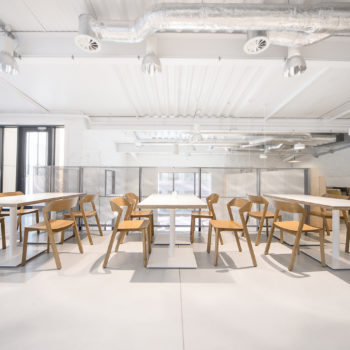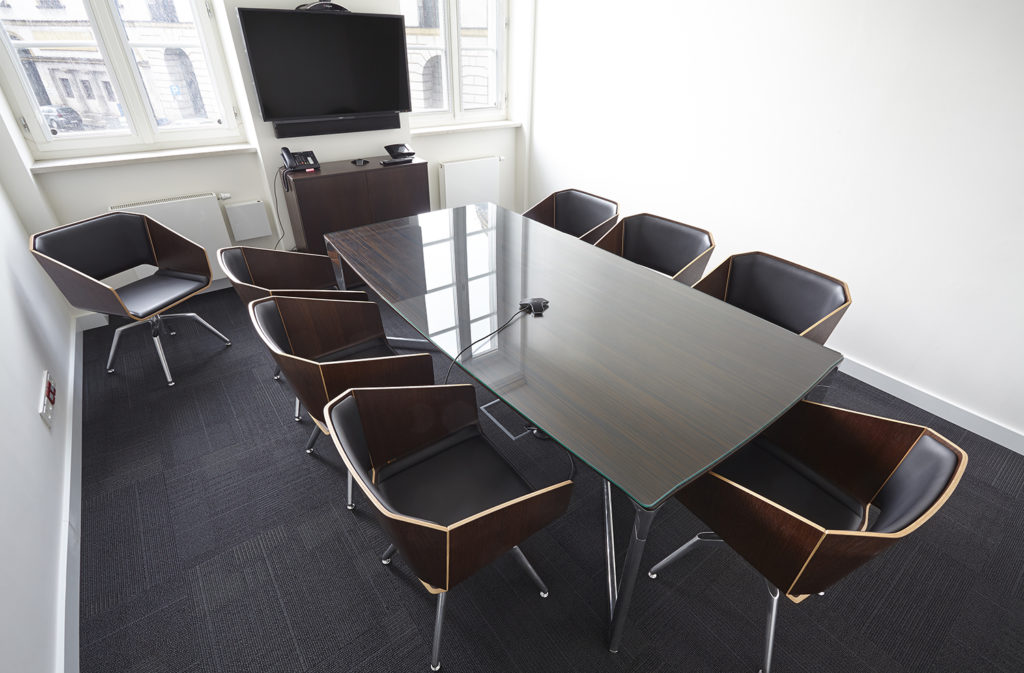 Podobnie sytuacja ma się z niedużą salą konferencyjną, gdzie znalazł się włoski stół na chromowanym stelażu z odlewu aluminiowego (również z tej samej kolekcji mebli co w pozostałych pomieszczeniach) oraz bardzo wygodne fotele z giętej sklejki, powleczone miękkimi elementami skórzanymi zarówno na siedzisku, jak i oparciu. Są to krzesła wyróżnione nagrodą Red Dot na największych na świecie targach wnętrzarskich, a nawiązujące do klasycznych rozwiązań wzornictwa przemysłowego.