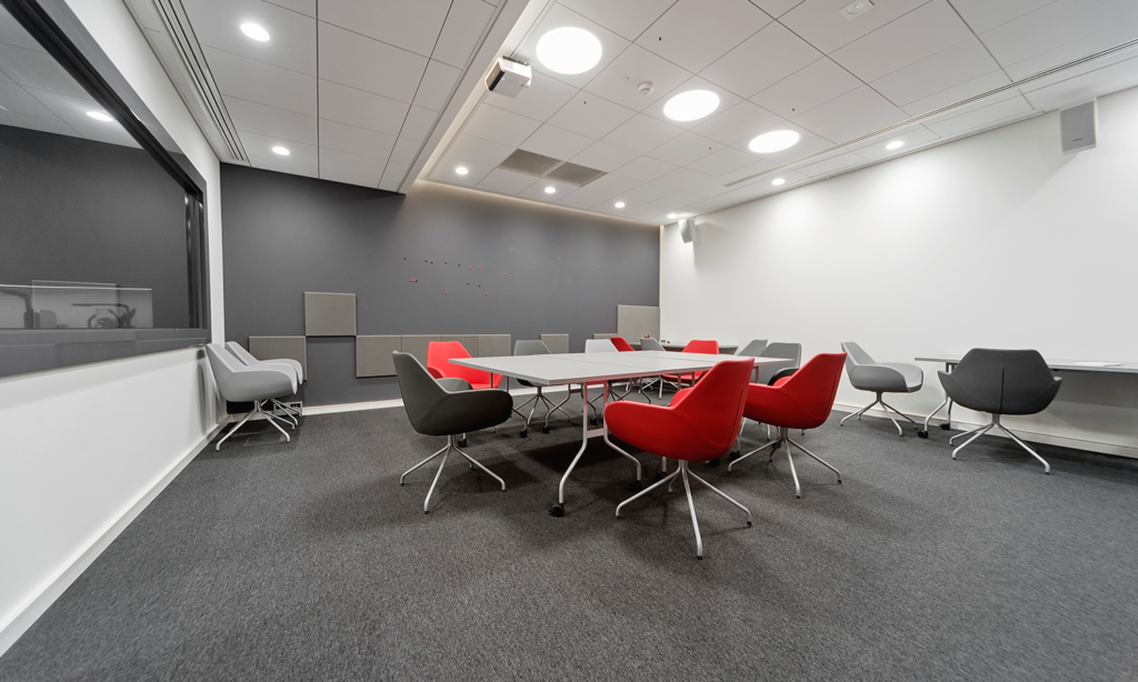 Kompleksowo wyposażane i wykańczane przez nas wnętrza obejmowały m.in. stanowiska pracownicze, sale konferencyjne, przestronne i rozbudowane kuchnie ze strefą relaksu, ale też specjalistyczne pomieszczenia do badań focusowych z przylegającymi do nich salami podglądowymi. Przedzielone lustrem weneckim, doskonale wygłuszone w skali dorównującej studiu nagraniowemu. Zresztą przeszło połowa dostarczonych przez nas na potrzeby tej inwestycji rozwiązań, wykonywana była na zamówienie.