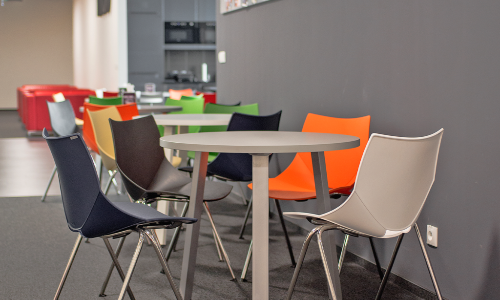 Wśród standardowego umeblowania znalazły się biurka i fotele pracownicze w mniejszym open-space. Zgrabne, proste biurka, umożliwiające łatwą rekonfigurację stanowisk pracy, wyposażone w kontenery cargo. Niektóre z kontenerów zostały wzbogacone o niestandardowe tapicerowane nakładki do siedzenia. Z kolei już stoły dostarczone do głównego open-space wykonywane były na zamówienie: skrajnie nowoczesne, inteligentne, z wewnętrznym okablowaniem.