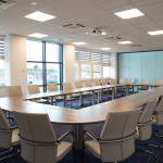 Wyposażenie centrali firmy transportowej było dla nas o tyle interesującym zleceniem, że poza dostarczeniem określonych mebli, mogliśmy się w jego trakcie wykazać również pewną dozą kreatywności. Do zadań Office Plus i współpracującego z nami architekta należało między innymi zaprojektowanie sufitów z oświetleniem w kuchni i lunch roomie oraz wymyślenie spójnej koncepcji sal konferencyjnych, które ostatecznie przyjęły nazewnictwo od polskich miast. Jak już wspomnieliśmy, w tym przypadku mieliśmy do czynienia z Klientem, z którym znamy się i współpracujemy od dawna, w związku z czym zostaliśmy obdarzeni dużą dawką zaufania i wiele z naszych pomysłów było później wprowadzanych w życie. Osoby odpowiedzialne za projekt chętnie słuchały naszych uwag, czego efektem było wykreowanie bardzo spójnych i ciekawych pod względem aranżacyjnym pomieszczeń.