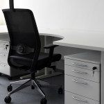 Tym, co rzuca się również na pierwszy rzut oka, jest nietypowy kształt biurek pracowniczych. Posiadają one specjalne, półkoliste wycięcia, dzięki którym pracownik ma lepszy dostęp do wszystkich części biurka, może wygodniej rozłożyć laptopa, a jego poruszanie się w obrębie stanowiska jest po prostu wygodniejsze. Większość tego typu biurek posiada dodatkowo blendy i tapicerowane ścianki działowe (szczególnie w strefie open space, gdzie mamy do czynienia z łączonymi stanowiskami pracowniczymi). Oprócz tego każda osoba ma dostęp do własnego, mobilnego kontenera, składającego się z piórnika oraz trzech lub czterech szuflad.